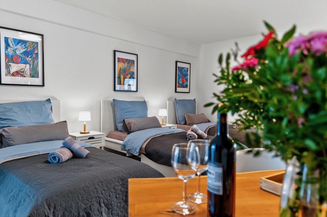 Diese moderne und helle 90 m² große Wohnung im schönen Bretten bietet Platz für bis zu 7 Personen mit 6 Einzelbetten und einem Schlafsofa. Sie liegt nur 15 Gehminuten vom Bahnhof Bretten und nur 2–3 Minuten von Geschäften, einem Supermarkt, einer Apotheke und einem Einkaufszentrum entfernt. Karlsruhe und Pforzheim liegen in der Nähe, und sowohl der Flughafen Stuttgart (STR) als auch der Flughafen Karlsruhe/Baden-Baden (FKB) sind etwa 65 km entfernt. Die Wohnung verfügt über eine Tiefgarage, einen Balkon, ein Badezimmer mit Badewanne, Dusche und WC, ein zusätzliches Gäste-WC und eine voll ausgestattete Küche mit allen notwendigen Utensilien und Geräten. Die lebhafte, farbenfrohe Einrichtung mit modernen Kunstwerken der mexikanischen Künstlerin Magali Lara schafft eine freundliche und kreative Atmosphäre. Diese Unterkunft ist ideal für Familien, Gruppen, Wartungsteams und Arbeitsteams, die viel Platz und eine gute Verkehrsanbindung suchen.