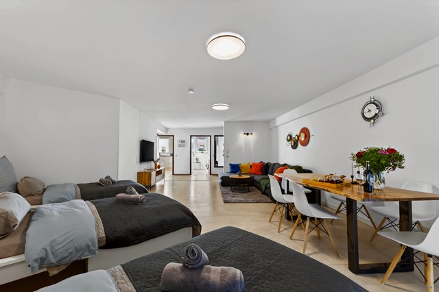Diese moderne und helle 90 m² große Wohnung im schönen Bretten bietet Platz für bis zu 7 Personen mit 6 Einzelbetten und einem Schlafsofa. Sie liegt nur 15 Gehminuten vom Bahnhof Bretten und nur 2–3 Minuten von Geschäften, einem Supermarkt, einer Apotheke und einem Einkaufszentrum entfernt. Karlsruhe und Pforzheim liegen in der Nähe, und sowohl der Flughafen Stuttgart (STR) als auch der Flughafen Karlsruhe/Baden-Baden (FKB) sind etwa 65 km entfernt. Die Wohnung verfügt über eine Tiefgarage, einen Balkon, ein Badezimmer mit Badewanne, Dusche und WC, ein zusätzliches Gäste-WC und eine voll ausgestattete Küche mit allen notwendigen Utensilien und Geräten. Die lebhafte, farbenfrohe Einrichtung mit modernen Kunstwerken der mexikanischen Künstlerin Magali Lara schafft eine freundliche und kreative Atmosphäre. Diese Unterkunft ist ideal für Familien, Gruppen, Wartungsteams und Arbeitsteams, die viel Platz und eine gute Verkehrsanbindung suchen.